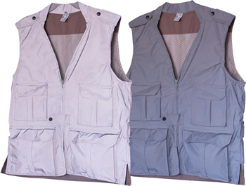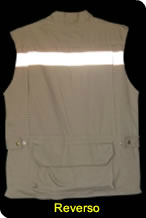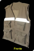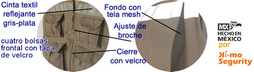 Chaleco Cazador fabricado en tela de gabardina 100% algodon con forro de malla de poliester y respirador por la parte de atras para mayor ventilación, cuenta con cuatro bolsas, dos de cargo al frente amplias y dos bolsas pequeñas en la parte de arriba, por la parte de atras una bolsa de canguro para libreta forma francesa y con una linea reflejante horizontal.