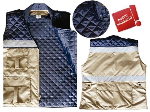 Chaleco cazador fabricado en tela repelente con forro de capitonado para temporada de Invierno o bajas temperaturas, con cuatro bolsas al frente, dos de cargo en la parte de abajo amplias y dos en la parte de arriba pequeñas con reflejante , por la parte de atras cuenta con una bolsa de canguro para libreta forma francesa y con dos linea de reflejante gris horizontal. EMPAQUE 30 PIEZAS.