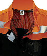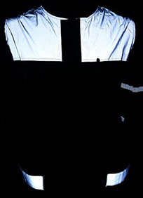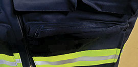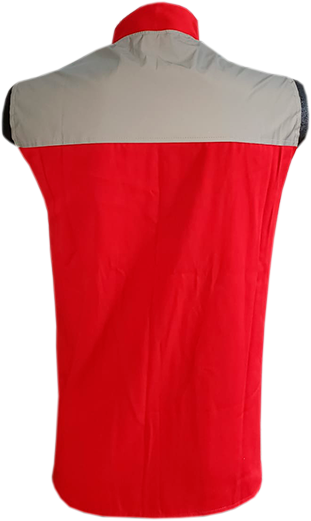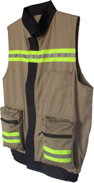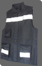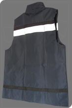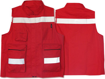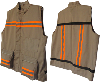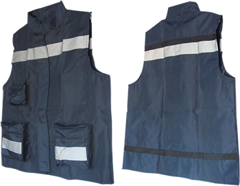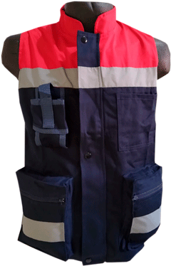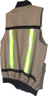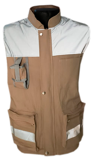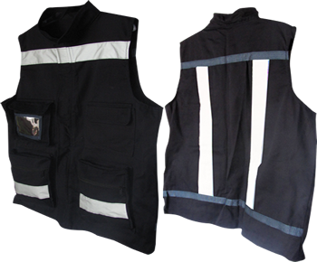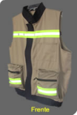 Chaleco Ejecutivo en tel de gabardina 100% algodón con reflejante gris 2" con cuatro bolsas al frente, dos de globo de carga en la parte de abajo y dos en la parte de arriba con tapas, una de ellas trae portacredencial y la otra es para lapicera, por la parte de atras cuenta con dos lineas de reflejante vertical y es 100% fresco.