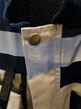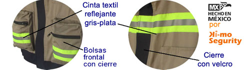 Tiras reflejantes en la parte superior frontal, como en las bolsas inferiores así también dos tiras más en la parte de la espalda en color amarillo neón con gris de 50 mm x 15 mm.