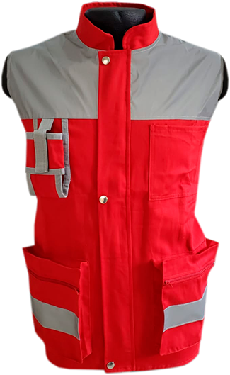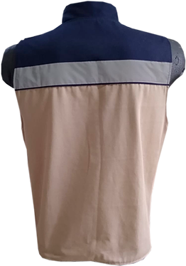 Chaleco Ejecutivo en tela de gabardina 100% algodón con reflejante gris 2" con dos bolsa alargadas al frente de 25 cm de ancho x 16 cm de largo, con lapicera y bolsa para el celular, cuenta con una pelerina a lo largo del frente donde va el cierre y con cuello de tortuga, 100% fresco y antiestático.