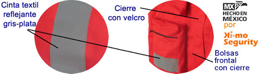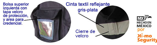 Consta de 6 bolsas al frente y 2 laterales; en una de las bolsas superiores lleva un porta credencial de 10 cm x 9 cm ancho y 2 eslabones para radio.